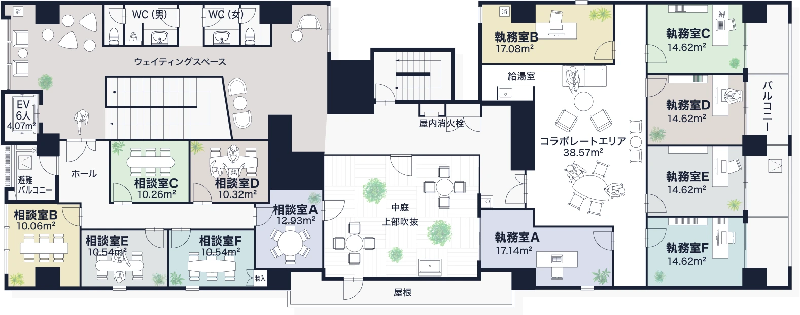 ゆとりのあるコラボレートエリアで情報交換・連携が自然に生まれ、士業同士の新たな出会いが次のビジネスを動かすきっかけに。